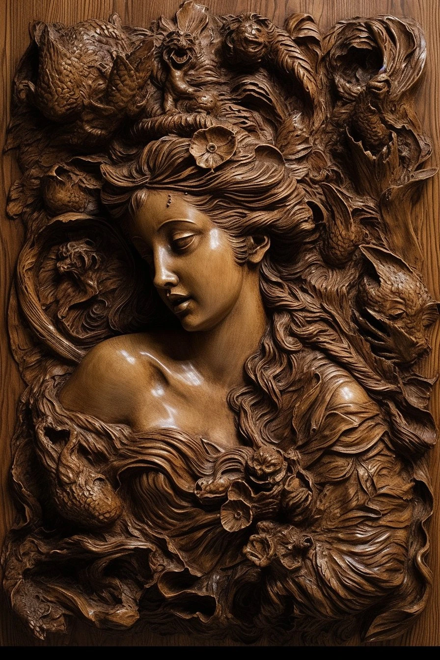the goddess Elizabeth Taylor, wood pannel carving, in the style of epic jungle art, highly detailed, oak texture, caravaggesque, chiaroscuro, Marquette, wrapped, spiral group, flat even soft lighting:: 3 --ar 2:3 --s 1000 --v 5