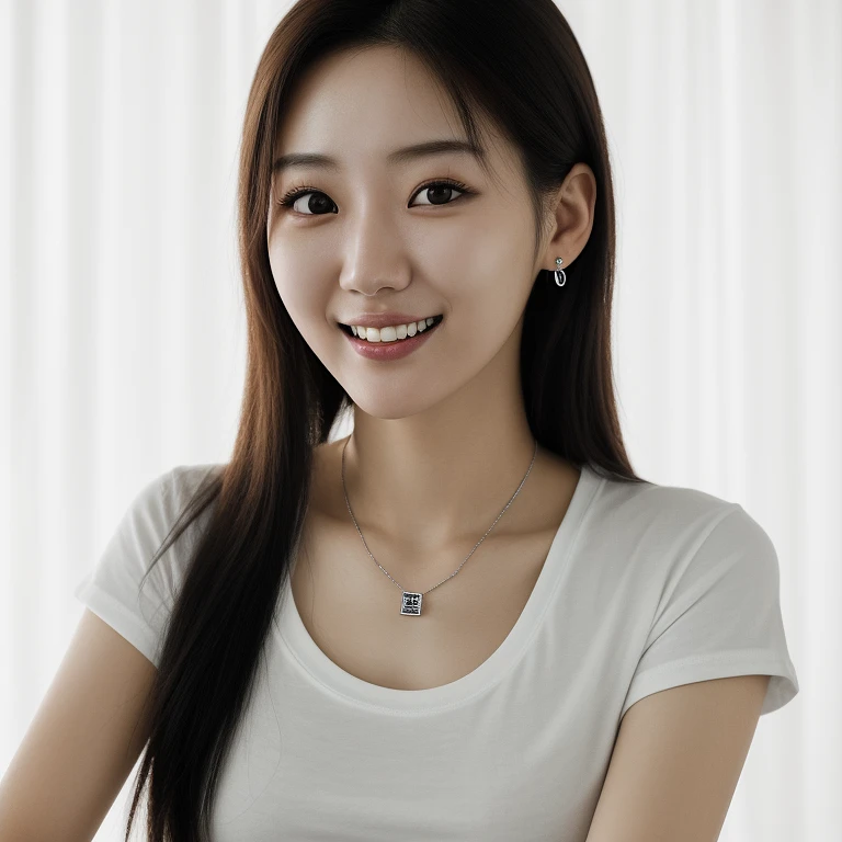 hyper realistic headshot photo of a 25 year old corean woman, white t-shirt, extreme slim, extreme skinny, expensive jewelry, looking into the camera, smiling slightly, ultrarealistic, soft lighting, 8k