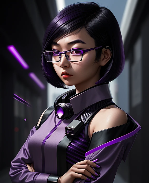 young Asian thoughtful woman, shoulder-length purple and black hair, nerd, techie, a pair of glasses with a future design which is attached to the neck, future, sci-fi, slightly dark make-up, 8k, cyperpunk,