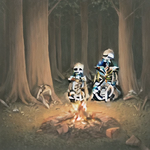 skeleton in the woods sitting on a log next to a campfire, high definition, 8k, by a random famous artist, painting, vibrant colors