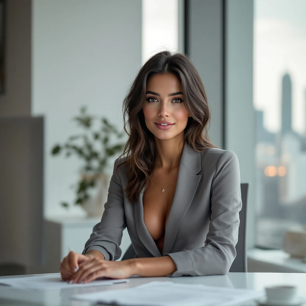 young athletic woman, Create an image of an attractive, slender woman working in a corporate office. She is dressed in a formal yet sensual outfit, perhaps a fitted blouse, necklines with a pencil skirt or a tailored dress that accentuates her figure. The setting is a modern, sleek office with minimalistic decor, featuring a large window with city views. The woman exudes an aura of calmness and sensuality as she sits at her desk, focused on her work. Her posture is confident, with a subtle smile on her lips, and her hair is styled neatly. The lighting is soft, enhancing the elegant and professional atmosphere.