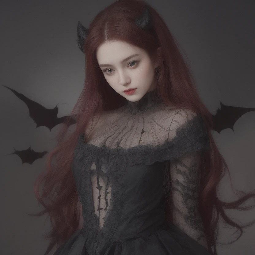 a woman with long, crimson hair and horns, wearing a black dress dress, set against a dark, smoky background with bats flying around her. - Her hair is long and crimson, with loose waves framing her face. - Her attire consists of a black dress that complements her crimson hair and horns. - The background is dark and smoky, with bats flying around her, adding to the eerie atmosphere. - The lighting is dim, with a full moon shining behind her, casting an ethereal glow. - The camera perspective is from below, looking up at the woman, emphasizing her powerful presence. - The style is fantasy art, with a focus on dramatic lighting and bold colors. - The camera used is likely a digital SLR or mirrorless camera, with a wide-angle lens to capture the expansive background.