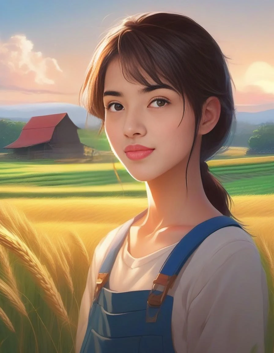 masterpiece, mid shot, anime style, highly detailed, concept art, oil painting, gouache, hard brush, centered, catgirl as a farmer, rice field, farmhouse background, farm life, cozy, award winning, vibrant color, gibli inspired, harvest moon, makoto shinkai, panoramic, HD,