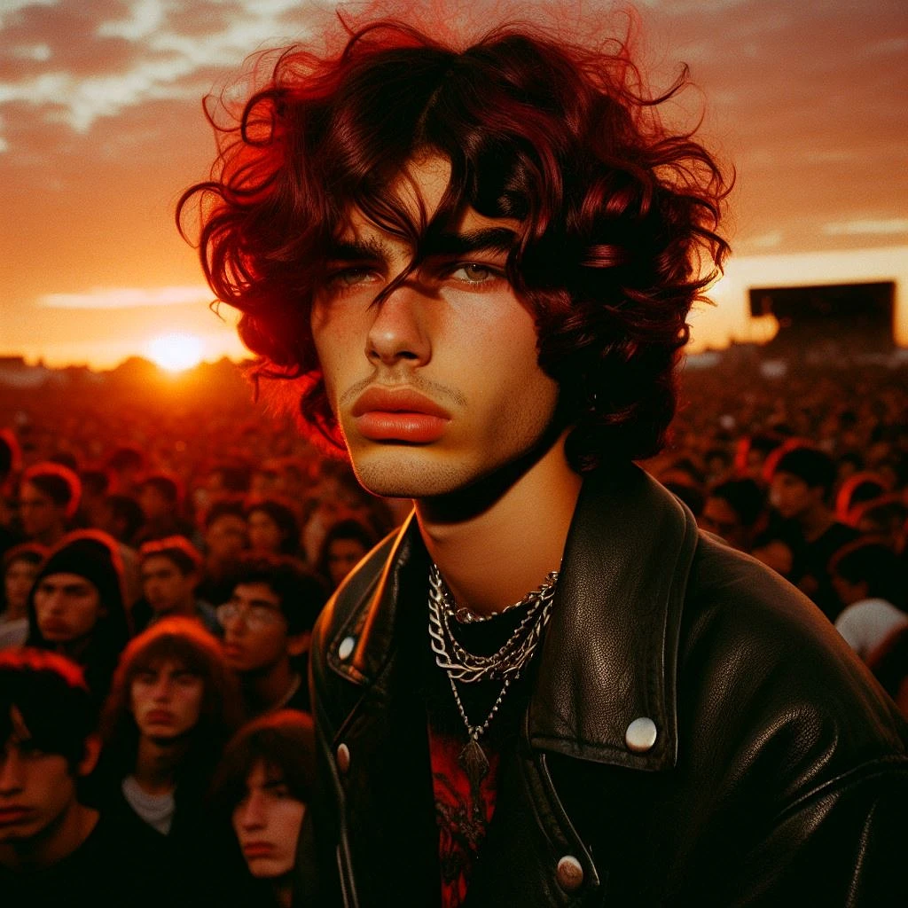 Intense sunset in the gritty streets of 90's Santiago, a photographer captures punk fashion embodied by a young man, grunge escence, exudes confidence and a sad and depressed demeanor in front of a mass rocking a stunning rock concert. Bobbed wavy hairstyle, rebellion of the era.