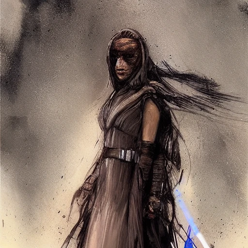 full portrait of a gorgeous female jedi, Star Wars themed, sparkling eyes, seductive, expressive, sci-fi, fantasy, visually striking, visible brush strokes, textured, grain, captivating, a blend of hyper-realistic drawing, digital illustration, ink painting, oil painting, watercolor painting , style of artists like Guy Denning, Russ Mills, Daniel F Gerhartz, intricate, detailed