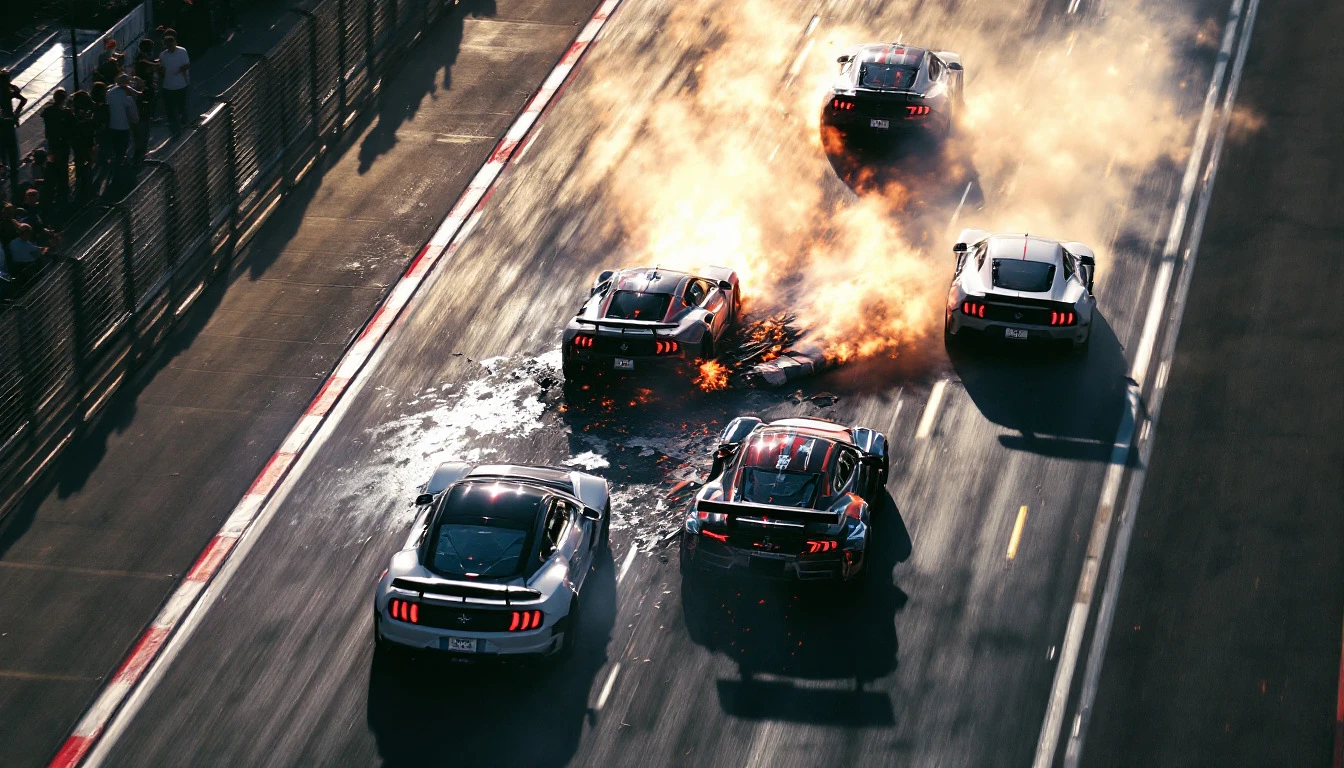 The race track is well lit by sunlight. Two cars collide on the track ahead and are carried towards the track fence, partially blocking the track. There is no fire. The other two race cars maneuver sharply to avoid the collision. They are avoiding the accident. There are no more people or other vehicles on the track. Spectators stand behind the track fence. The camera looks sideways and slightly overhead and pans behind the passing automobiles. Cyberpunk style.