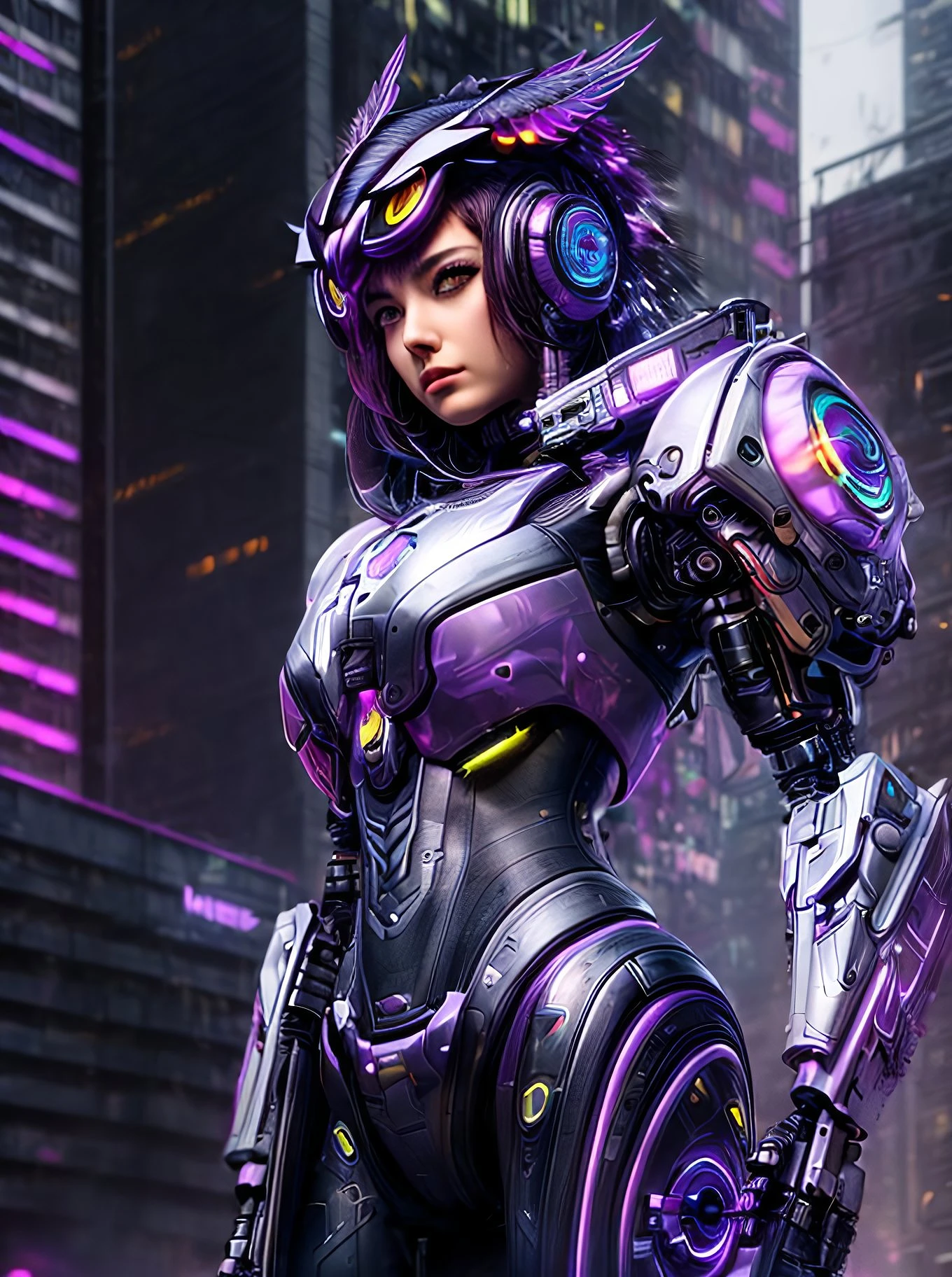 Cybernetic owl person leaning against a building, nvinkpunk style, (owl head) , large head, feathers, (cyberpunk) , (purple eyes) , highly detailed, CGI, beautiful, punk, (sharp detail) , art by artgerm