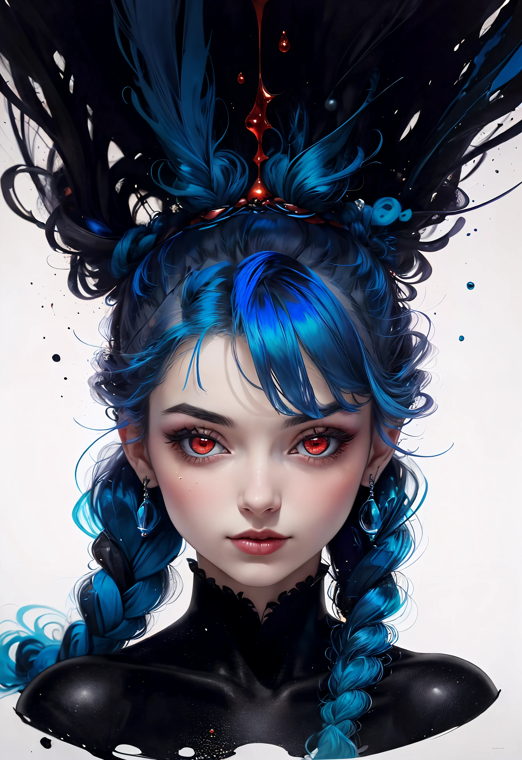 entwining portrait of young woman, (blue hair in braids:1.2) , tilt shift shot, airbrush art, (red eyes:1.2) , symmetrical face, accurate anatomy, gossamer, ultra-fine details, sharp focus, swirling gouache, resin drip ( by tim burton, mark ryden, bartolomeo veneto:1.2) , torn paper and ink blots, <lora:add_detail:1> , 16k, UHD, HDR, (Masterpiece:1.5) , (best quality:1.5)