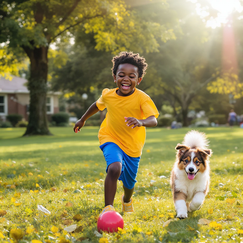 A highly detailed image of a joyful African American boy with curly hair, wearing a bright yellow t-shirt and blue shorts, playing with a red ball in a lush green park next to his house. The boy is laughing and running, with a playful collie puppy by his side, its fur a mix of white and brown, ears perked up and tail wagging. The scene is filled with vibrant colors, with the sun casting a warm golden glow over the park, highlighting the boy's and puppy's expressions of pure happiness. The image is isolated on a white background and fits perfectly within the border.