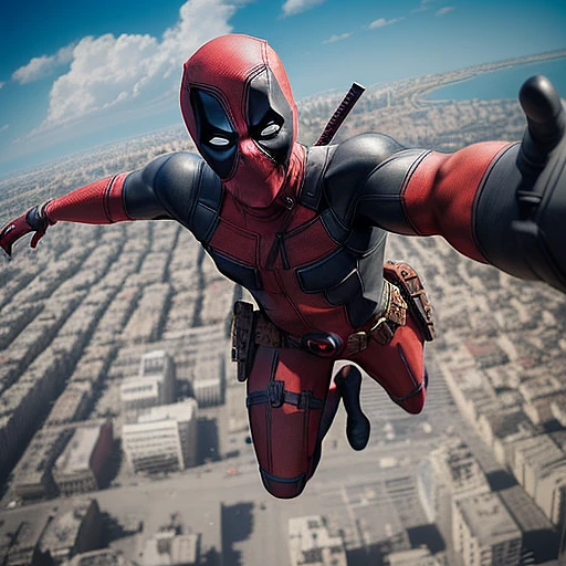 A selfie of Deadpool in Baku City, he is flying above the city, wearing his red and black costume, in the style of photorealistic art --ar 9:16 --stylize 750