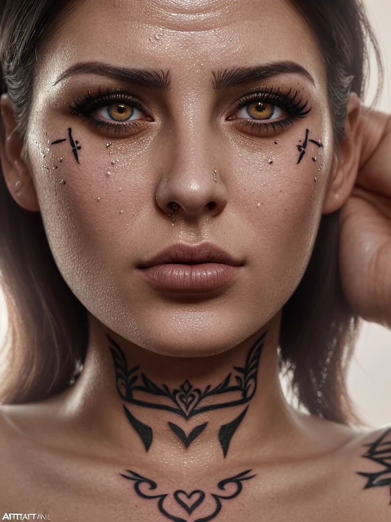 close-up portrait female lebanese, facial heart tattoo above her eyes, luxury, deep eyes, bright dark illumination, very detailed artwork, trending on artstation, symmetrical, cinematic, hyper realism, high definition, octane render, 8k