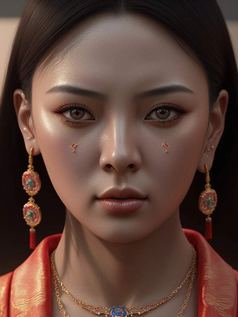 close-up portrait female chinese, deep eyes, luxury accessories and jewelry, bright colors, dark illumination, very detailed artwork, trending on artstation, symmetrical, cinematic, hyper realism, high definition, octane render, 8k