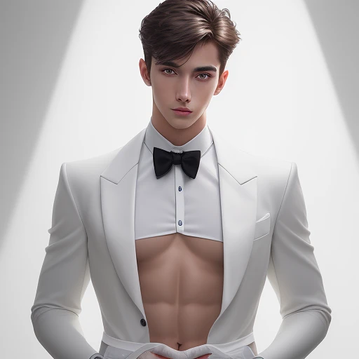 photograph, upper-body shooting, young man professional model, sensational fashion style, Hasselblad H6D-100c with a Hasselblad HC 100mm f/2. 2 lens, aperture at f/8, ISO 100, solid white environment, studio lights setting, ultra-realistic, UHD image with many details --ar 9:16 --style raw --stylize 700