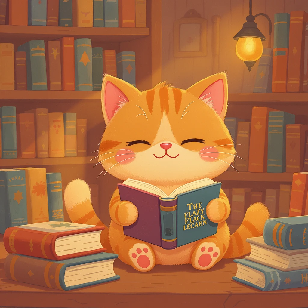A cute cartoon cat reading a book in a cozy library, warm colors, digital painting