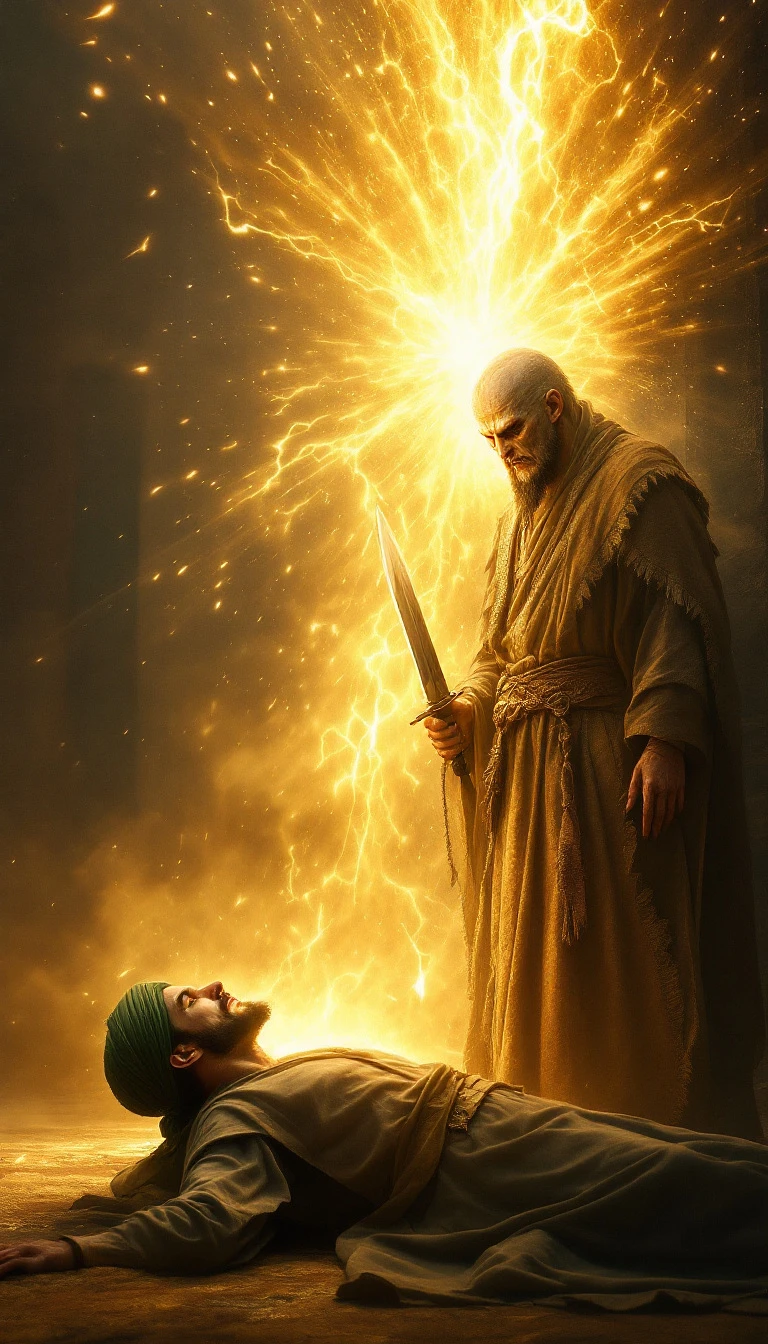 "Inside the Kufa Mosque during the Night of Qadr, create a dramatic and spiritual scene. Imam Ali, a tall figure with a green turban and gray robe, his face completely replaced by a radiant, blinding golden-white light, so intense that it forms a glowing orb where his face should be, with no facial features, eyes, or expressions visible at all, is in prostration, a soft golden glow emanating from him. Directly behind him stands Ibn Muljim, a man wearing a long, flowing Arabic robe with jagged edges and a sash tied around his waist, holding a sharp, dark sword in his hand, his sinister, Arabic-style face with a gaunt, weathered look, a crooked nose, hollow cheeks, a scruffy black beard, deep-set dark brown eyes, and a twisted, menacing scowl, radiating guilt and malice, making him appear grotesque and terrifying. Suddenly, a massive burst of golden-white light erupts from Imam Ali’s head, symbolizing his spiritual transcendence, filling the entire mosque with radiance. The light overpowers Ibn Muljim’s dark presence, creating a stunning contrast, as the mosque’s interior glows with divine energy