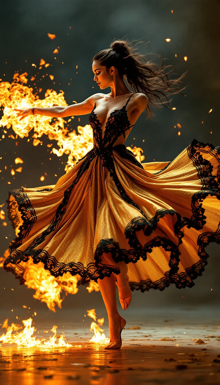 "Golden Spin: A Dance of Radiance and Fire": A live-action film captures a female dancer, seen at a 45-degree angle of the screen. She moves in a series of strong, flowing movements, her gold dress with shimmering black lace creates a dynamic form, as she performs an intense fire dance. The skirt seems to ignite as she moves, with flames swirling around her form in a powerful display. The lighting is bold and brilliant, highlighting the fiery elements and with a surreal, imaginative backdrop.