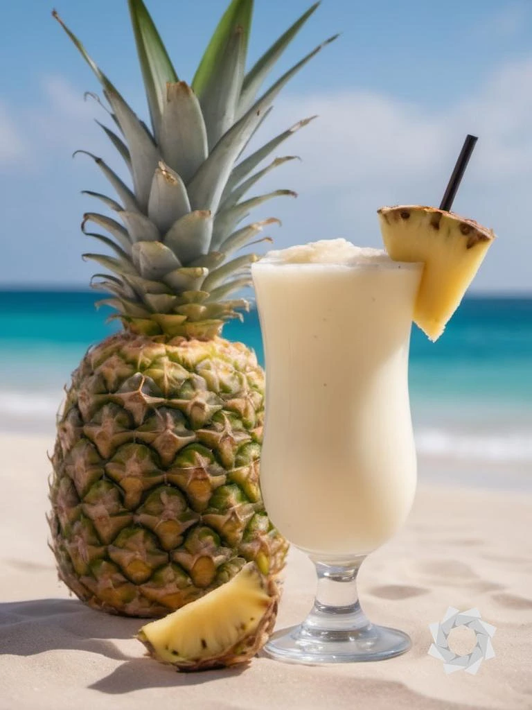 a mouth - watering shot of a tropical piña colada cocktail, garnished with a slice of pineapple and a cocktail umbrella, set against a backdrop of sandy beach and crystal clear ocean, warm cinematic colors, cinematic lighting