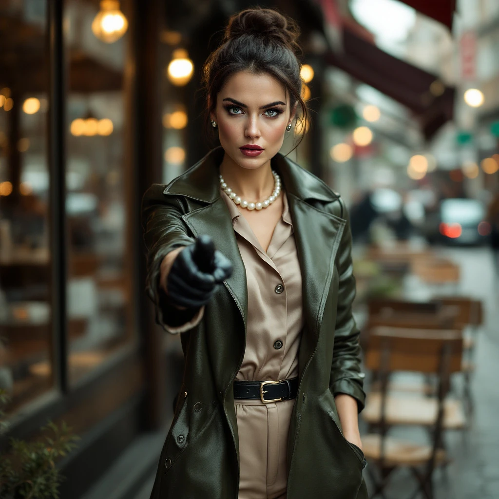 46 year old elegant, angry, squinting, confident caucasian lady with dark hair in a bun, blue eyes. Wearing a silk blouse, a long dark green fitted leather jacket with the belt loose, a simple small pearl necklace, beige colored leather pants, long black patent leather gloves. She is standing in front of a cafe pointing at the camera It is outside at a row of trendy cafés on a city street. The lady is wearing black high heeled shoes. The shoes are visible in the picture.
