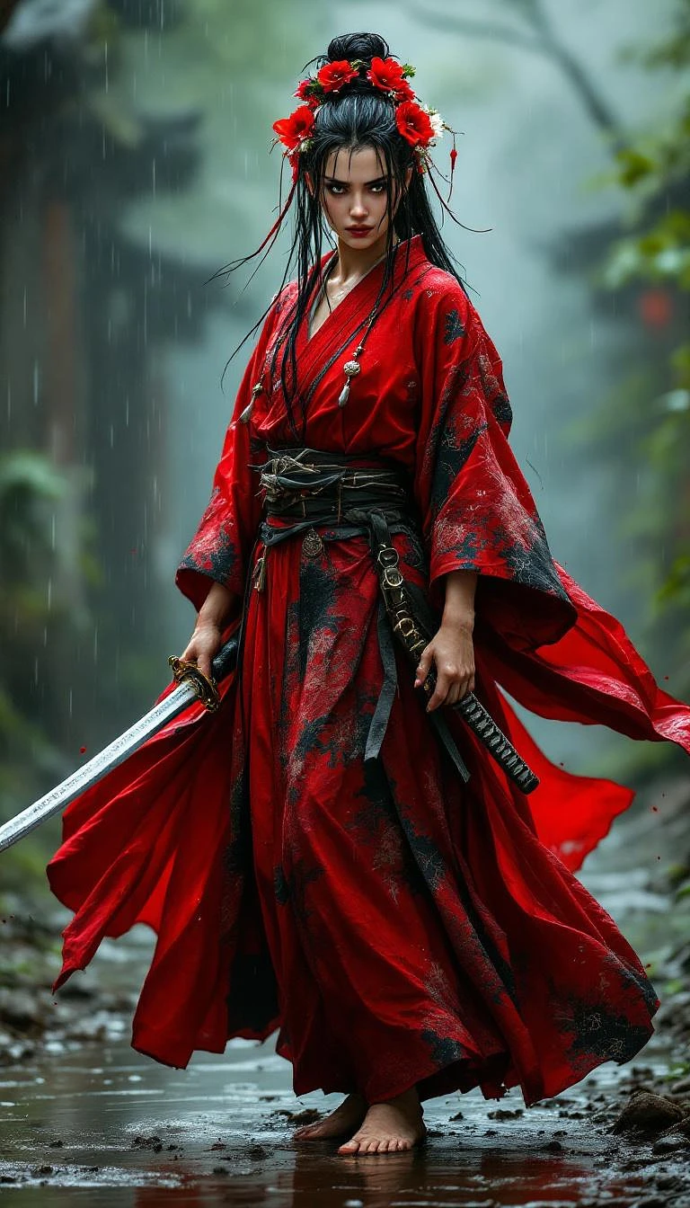 Full body view of a fierce samurai woman of Japanese descent in a flowing red and black kimono, her long, raven-black wet hair is styled in a messy bun adorned with vibrant red and white flowers and dangling ornaments. barefoot, feet cover of mud on muddy ground of a ancient village, gripping a katana tightly, under pouring rain