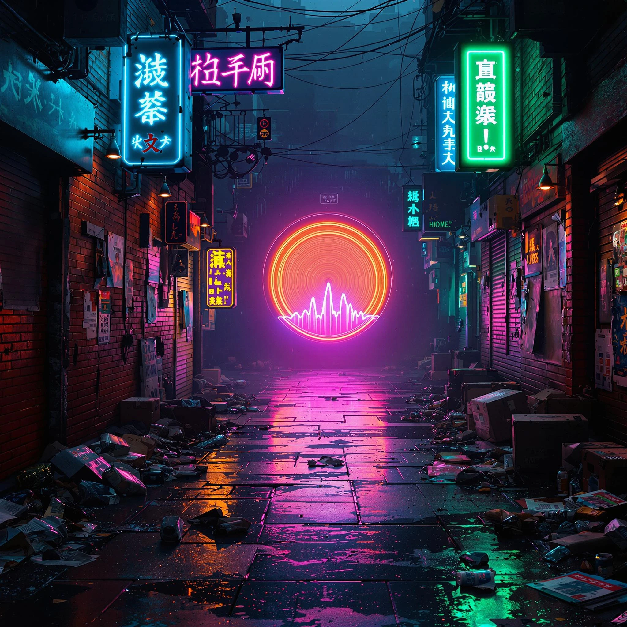 (masterpiece, digital art:1.5) , hyper-realistic, cinematic scene set in a dark, dystopian alleyway with a gritty, cyberpunk aesthetic. The alley is narrow, filled with layers of grime, and has an oppressive atmosphere. The walls are made of weathered, cracked red bricks, partially covered by peeling, tattered posters in Japanese kanji. These posters advertise neon-lit ramen shops, nightclubs, and underground techno raves, all with torn edges and layers of aging. The text is entirely in Japanese, making it feel authentic, and the posters are scattered across the wet concrete ground. The alley floor is cluttered with garbage: dented U. S. metal trash bins, some of them tipped over, spilling over with discarded food containers, crumpled newspapers, and plastic wrappers. Broken glass bottles are strewn across the pavement, some still half-filled with rainwater, creating small reflective puddles. Near the walls, discarded cardboard boxes, littered with grime and wet from the rain, add to the chaotic feel. Dim neon lights flicker from large signage above the alley, featuring vibrant, glowing kanji text in hot pink, bright green, and electric blue. These neon signs reflect off the wet pavement, casting flickering light on the scattered debris and adding a surreal atmosphere to the scene. A misty haze lingers above the ground, enhancing the reflections and creating an ethereal, haunting mood. At the end of the alley, a large, glowing, circular portal pulses with bluish-purple energy. From this portal, a stunning, audiovisual waveform begins to emerge. The waveform, glowing with intense neon colors, starts as a sharp peak and valley, like an undulating sound wave, and stretches down the alley towards the viewer. Its digital, glowing edges ripple with energy and light, like a sound wave in motion. As the waveform moves, its peaks shimmer with electric green, pink, and cyan hues, each pulse corresponding to the rhythm of an unseen beat. The waveform’s motion distorts the surroundings subtly: trash and paper scraps flutter in the wake of its energy, and the puddles ripple, catching the shifting light. The waveform feels dynamic and alive, as though it’s not just part of the environment but a manifestation of sound and light itself. It looks like a 3D visualization of a techno beat, a continuous, undulating presence cutting through the gritty, static world of the alley. The camera angle is tilted slightly downward, looking down the alley in such a way that the glowing waveform leads the viewer’s gaze toward the end of the alley. The perspective emphasizes the scale of the portal and the way the waveform seems to fill the space, consuming the alley with its vibrancy. The alley is shrouded in a blend of shadow and neon glow, with the waveform as the focal point that brings motion and energy to the otherwise still, decaying environment. On the ground, the scattered debris and broken bottles reflect the vibrant colors of the waveform, adding visual depth and texture to the scene. The fog and mist intensify the neon’s glow, creating a dreamy, otherworldly atmosphere. Above the portal, faint beams of light cut through the mist, casting intricate shadows and enhancing the sense of mystery and impending movement. The entire scene is a blend of futuristic sound energy and decaying urban chaos, with the waveform acting as a bridge between the two worlds, filling the space with pulsating light and sound. The artwork’s color palette is dominated by dark, gritty tones contrasted with vivid neon, creating a striking balance between desolation and vibrant life.