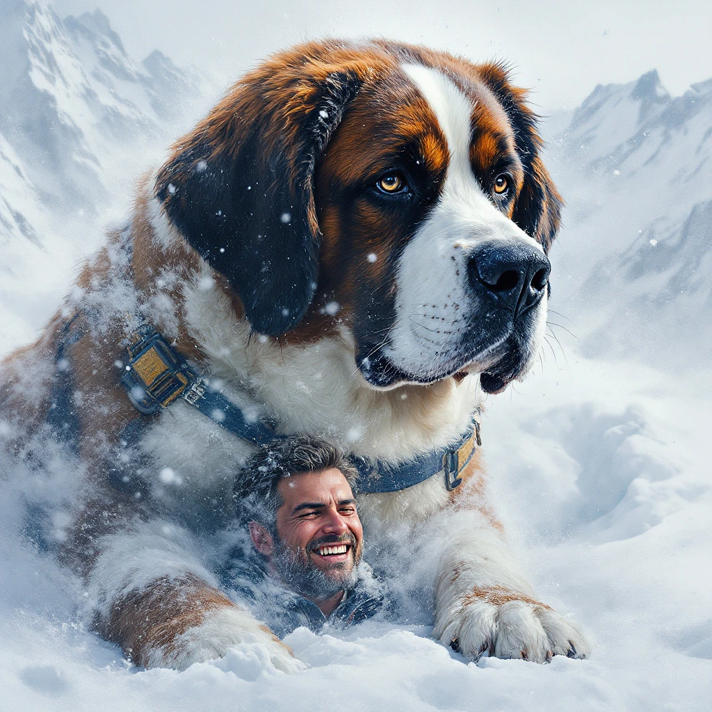 An award-winning, emotionally powerful double exposure oil painting that captures the heroic moment of a Saint Bernard dog rescuing a man trapped in the snow. The central figure is the loyal and strong Saint Bernard, its massive form blending seamlessly with the snow-covered landscape and the figure of the man, struggling to escape the snow’s suffocating grip. The dog’s face is a picture of determination, its eyes filled with resolve as it pushes through the blizzard, while the man’s form dissolves into the snow, his expression one of relief and gratitude as the dog’s strength becomes his lifeline. The double exposure effect merges the Saint Bernard’s silhouette with swirling snowflakes, icy winds, and the dark shadows of a wintry mountain landscape, symbolizing both the overwhelming forces of nature and the unwavering bond between man and animal. The background features towering snow-covered peaks, with snowdrifts that seem to trap the man, while the Saint Bernard’s image bursts forward, cutting through the icy scene in a dramatic contrast. The palette is dominated by cool blues, whites, and grays, with touches of warm browns and reds highlighting the dog’s fur and the man’s coat, emphasizing the warmth and hope the dog brings to the dire situation. The thick texture of the oil paint captures the harsh, frozen environment and the strength of the Saint Bernard’s movement, evoking the immense power and courage needed in the face of nature’s fury. This double exposure masterpiece conveys themes of heroism, loyalty, and survival, creating a powerful, visually striking depiction of the life-saving bond between a dog and its human