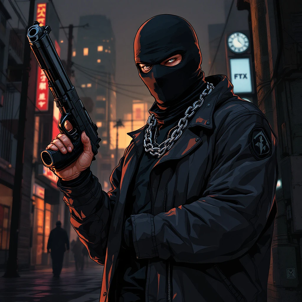 Cartoon illustration of a man in a black mask with a chain around his neck holding a gun and showing his full body, gta chinatown art style, gta art style, gta 5 comics art, gta chinatown wars art style, gta cover 2d game art, gta cover 2d game art, gta iv art style, rotoscoping, gta art style, gta v artwork style, gangsta rap