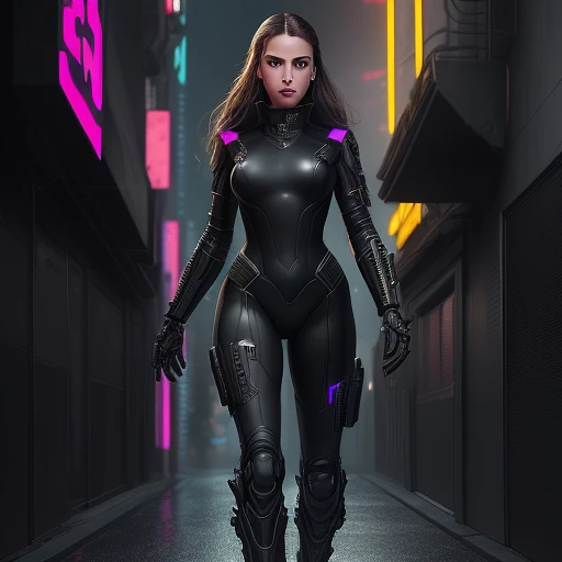 create image of woman, face teenager, style actress, hyperrealistic and detailed full-length portrait of gorgeous woman| black combat uniform| in dark neon alley| ((cyberpunk) )| full body shot| photorealistic| sharp focus| digital art| concept art| by Vittorio Matteo Corcos and Albert Lynch| in [poolsuite style]