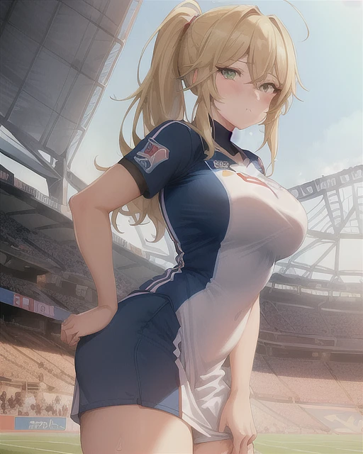 1girl, painting of a girl american football player, 6:00 pm, stadium, team uniform with logo, anime, anime face, art by artgerm and greg rutkowski and alphonse mucha, 8k, artgerm anime, professionally color graded, depth of field, hdr, volumetric lighting