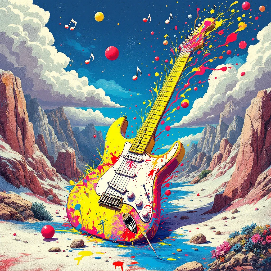 "A vibrant fusion of rock and art, featuring a surreal landscape with an electric guitar transforming into a paintbrush, colorful splashes of paint in the air, music notes floating like abstract art, in a pop-art style with bold colors like red, yellow, and blue, creating an energetic and artistic composition. "