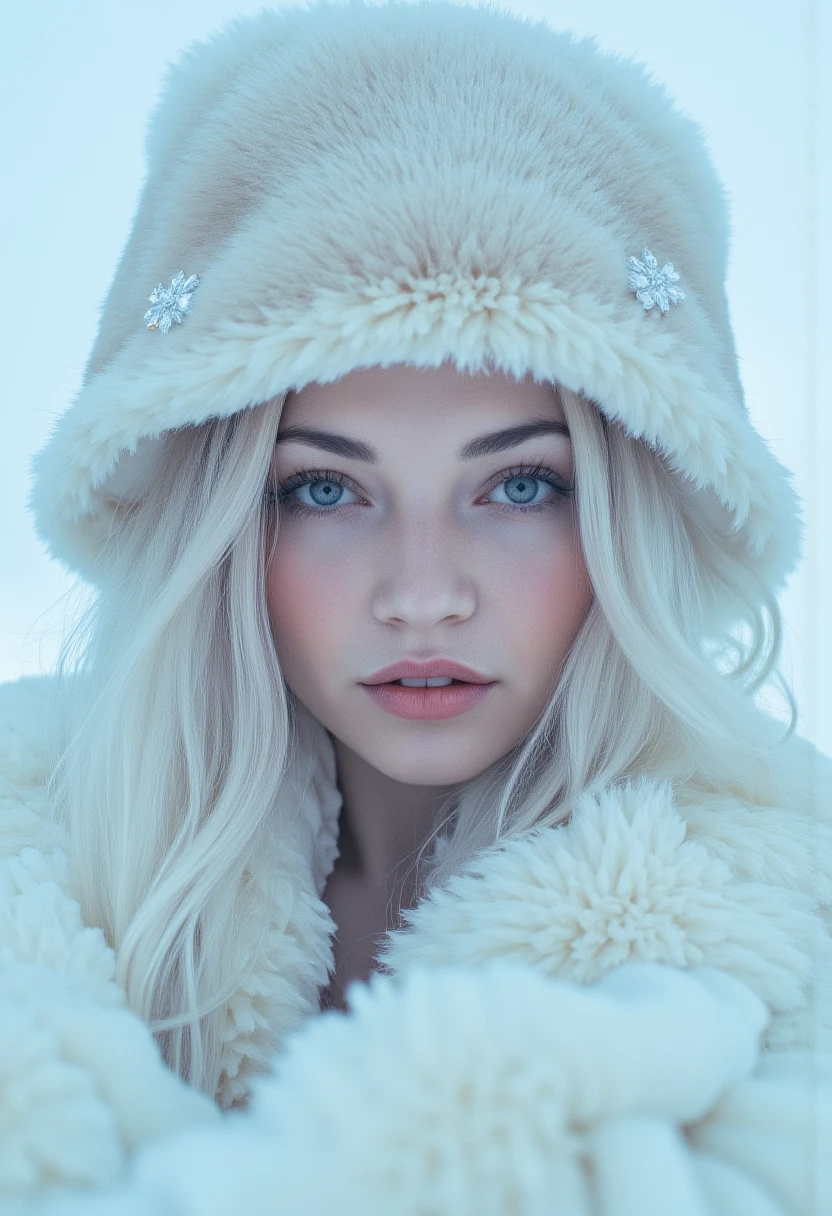 A lithe ethereal woman with silvery-white hair flowing like silk, her pale skin glowing softly against a delicate white fur coat and hat. Her ice-blue eyes, framed by soft pink makeup and pearl earrings, radiate otherworldly wisdom. Snowflakes drift in the soft, pale blue gradient background. Gentle, even lighting highlights her flawless complexion and delicate textures, creating an ethereal, serene atmosphere. Her expression is calm and enigmatic, as though lost in thought. The scene is bathed in a cool, tranquil color grading, with subtle film grain adding to the mystical ambiance. aidmaRealisticPeoplePhotograph