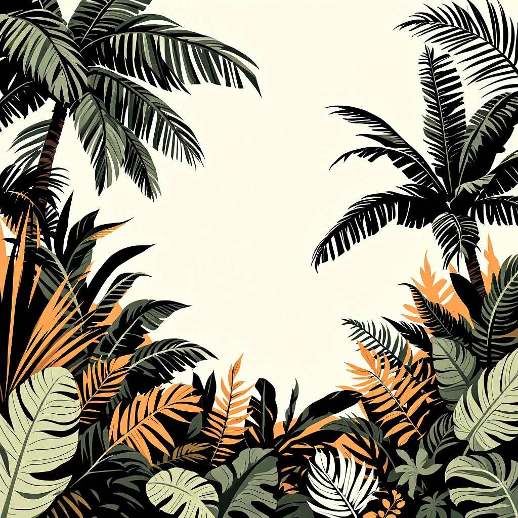 graphic jungle scene illustration background for a 3x3 grid. in the center is a small white circle. on the right there is a bananapalmtree overlapping the grid. in the style of pop art bold and graphic imagery, streetwear-brand style, jungle style, black - and - white block prints with some light orange and dark green --v 5. 0 --s 250