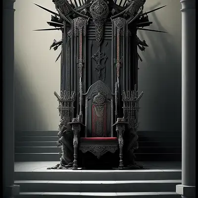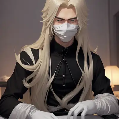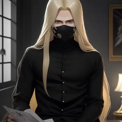 -style anime . A young man in his 20s with a moderate build and long blonde hair, The young man's hands move deftly as he manipulates the strings, His face is featureless, focuses intently on manipulating the strings of a set of dolls. . , sits at a desk inside a dimly lit room decorated with the decor of a noble palace. He wears a long-sleeved black shirt. The overall scene evokes a sense of mystery, intrigue, and manipulation. --ar 51:91