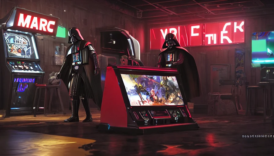 concept art of role - playing games darth vader playing an arcade machine. macro. unreal engine 5. octane render. vray. arnold. maya. 1 8 mm lens. gopro, low angle, wide lens. trending on artstation. depth of field. colorful. d & d. centered image.