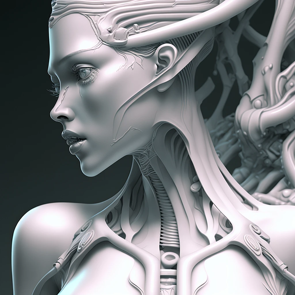 A real perfect female anatomy made by beautiful and elegant pure white bio organic ceramic, painted by Luis Rojo, Alphonse Mucha, Ross Train, artgerm, Sakimichan + hyper details + concept futuristic style and ecorchè style + cinematic lights + photo bashing + epic cinematic + octane render + extremely high detail + legendary aesthetic + realism + hyper details + depth of field + cinematic lighting + sharp focus + denoise + octane render + arnold render + vfx + post processing + 8k --no blur --v 4