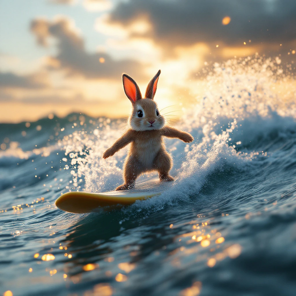 photorealistic 32k, baby bunny surfing a wave, cinematic lighting, sunset