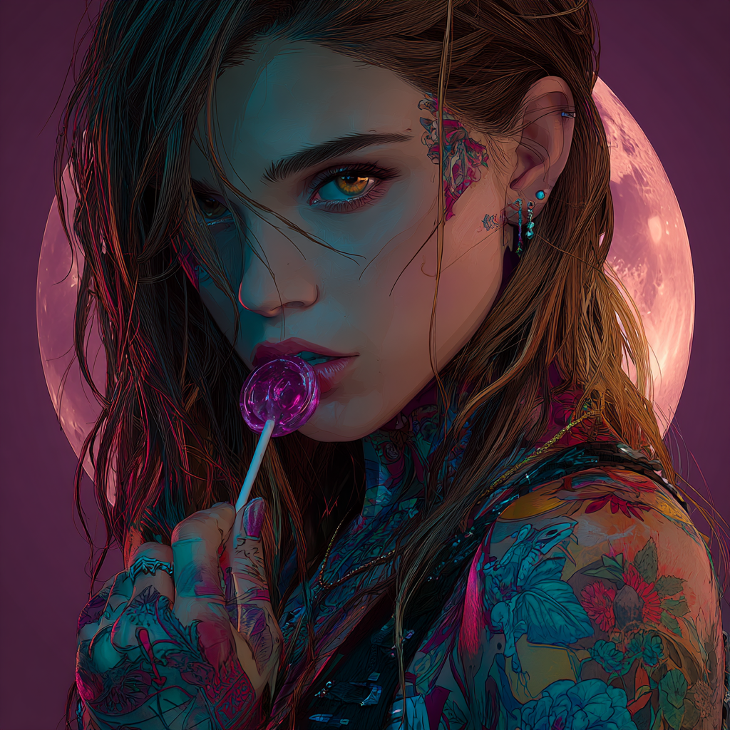 Beautiful 28 year old beautiful woman with long brown hair , brown eyes , messy wet hair, brown orangish eyes, with many tattoos licking a lollipop, in the style of neon realism with dark purple and teal colors, against a dark pink moon background. Highly detailed illustrations with a colorful, intricate character design, created using digital art techniques --profile cpqgag4