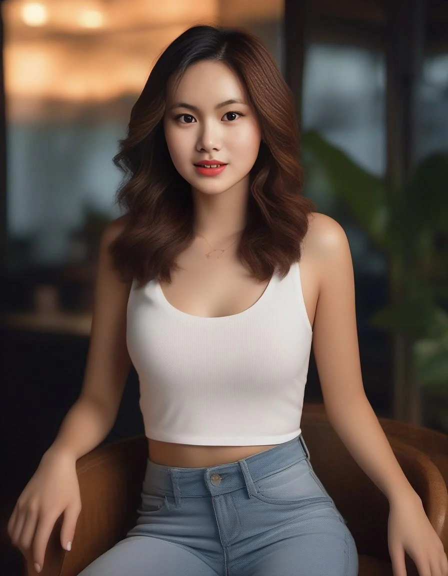 (16 to 21 years old:1.8) , best quality, masterpiece, ultra high res, (photorealistic:1.4) , 1girl, tank top and jeans for women, little curly hairstyle, deep shadow, detailed face, detailed eyes, shiny skin, sunset, perfect anatomy, sit on a dining chair, perfect fingers, uplight