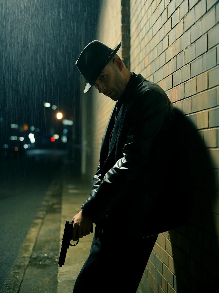 Create an atmospheric photorealistic photograph depicting a gangster leaning with his back against a brick wall down a dark alley. He has a pistol in his hand. His hat is pulled down over the top half of his face, casting a shadow. (It is a dark rainy night:1. 9. The only light is from a strre light down the street. Moody, cinematic, dark