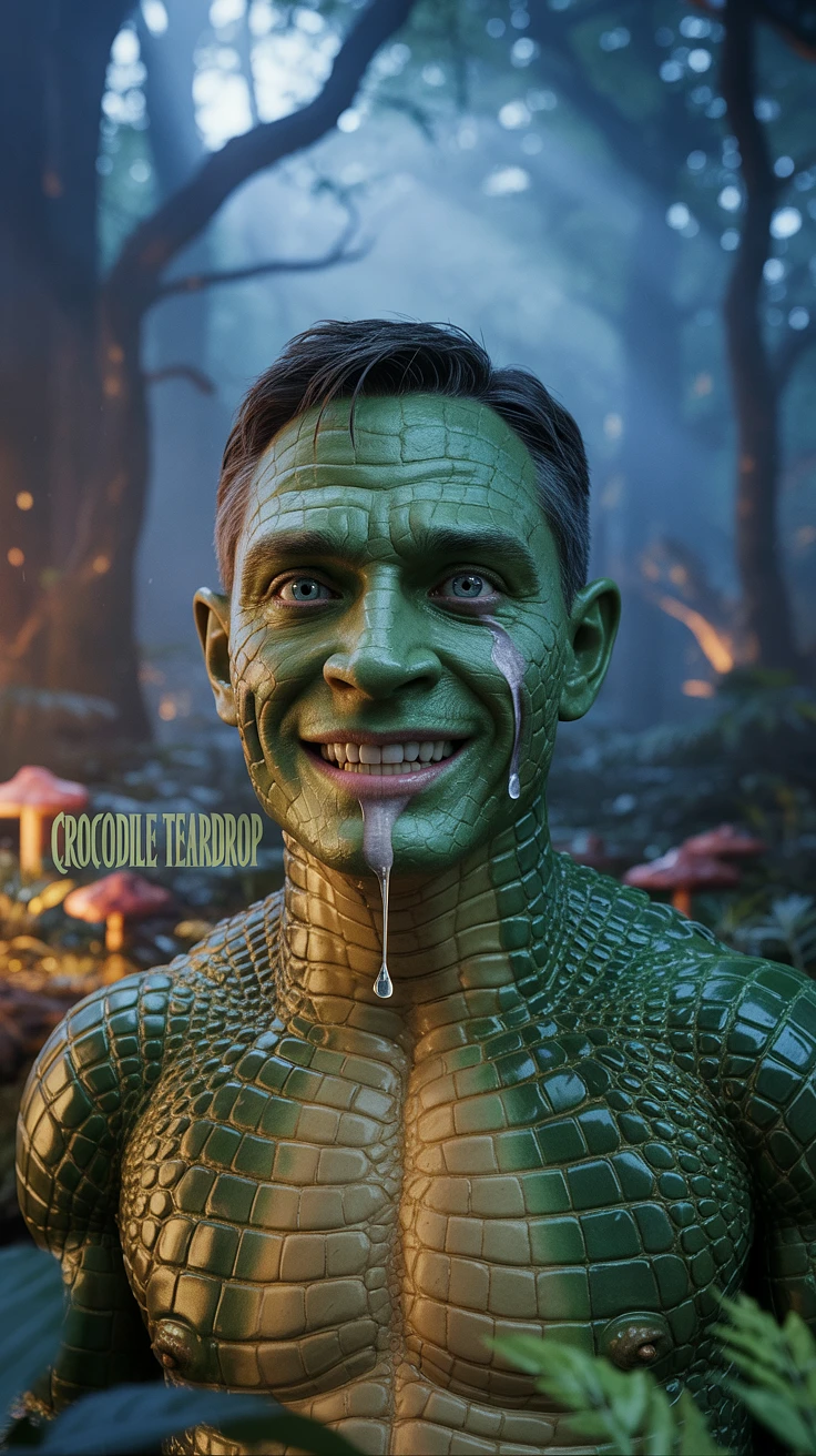 A crocodile-skinned humanoid man with textured, emerald reptilian scales, smiling eerily while a single, hyper-detailed teardrop rolls down his cheek — the teardrop is in sharp focus, glistening with reflections. He stands in a magical and creepy twilight forest, fog swirling between twisted trees, glowing fungi, and scattered wet leaves. Cinematic lighting with deep shadows and glowing highlights creates a surreal mood. The figure looks directly at the viewer, POV composition, intense eye contact. Typography “CROCODILE TEARDROP” in bold gothic font hovers subtly in the atmosphere, blending with the scene’s magical mist