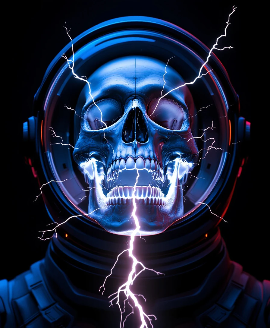 astronaut open helmet, human skull, perfect teeth, lightning coming out of the open mouth, futuristic, cinematic lighting, hyper detailed, intricate design, masterpiece, concept art, 8k, uhd