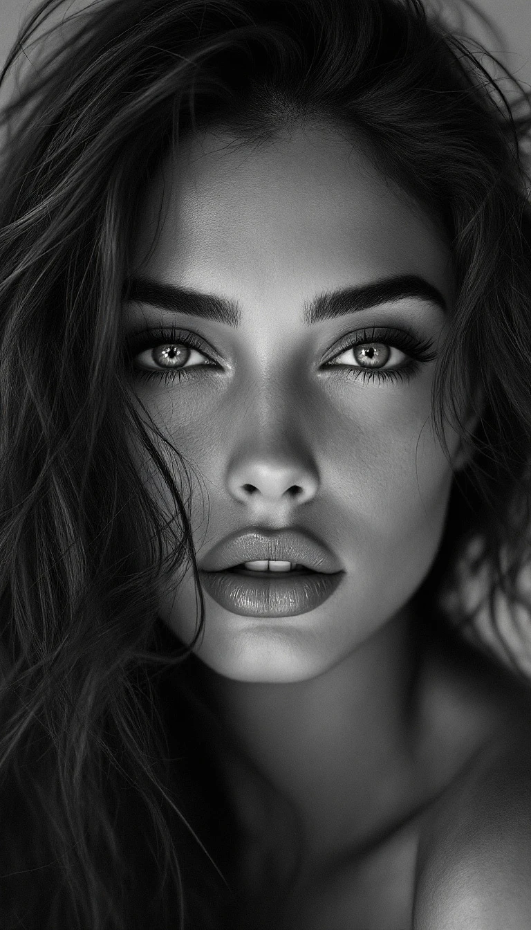 "In this striking high-resolution black and white portrait, a supermodel exudes an ethereal allure, framed by a cascade of tousled flowing dark locks. Her intense, expressive eyes are like twin pools of mystery, holding the viewer’s gaze with an unwavering, captivating stare. Delicate light reflections dance across her flawless skin, enhancing the soft shading and smooth transitions that define her exquisite features. Her thick, perfectly shaped eyebrows arch gracefully above her eyes, complementing full, glossy lips that invite endless fascination. The subtle play of shadows highlights her elegant bone structure, adding depth and dimension to the photograph, creating a harmonious balance of light and form that captivates and inspires. "