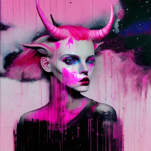 single imge, a glitch art dirty over lay portrait of a demonic horned woman pink lipstick, pink glossy hair, in the style of jeremy mann, monumental ink painting, cracked, starry sky background serene face, , oscar niemeyer <lora:Sweeping style:1.0> 2024-08-04 19:02 V6. 1