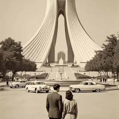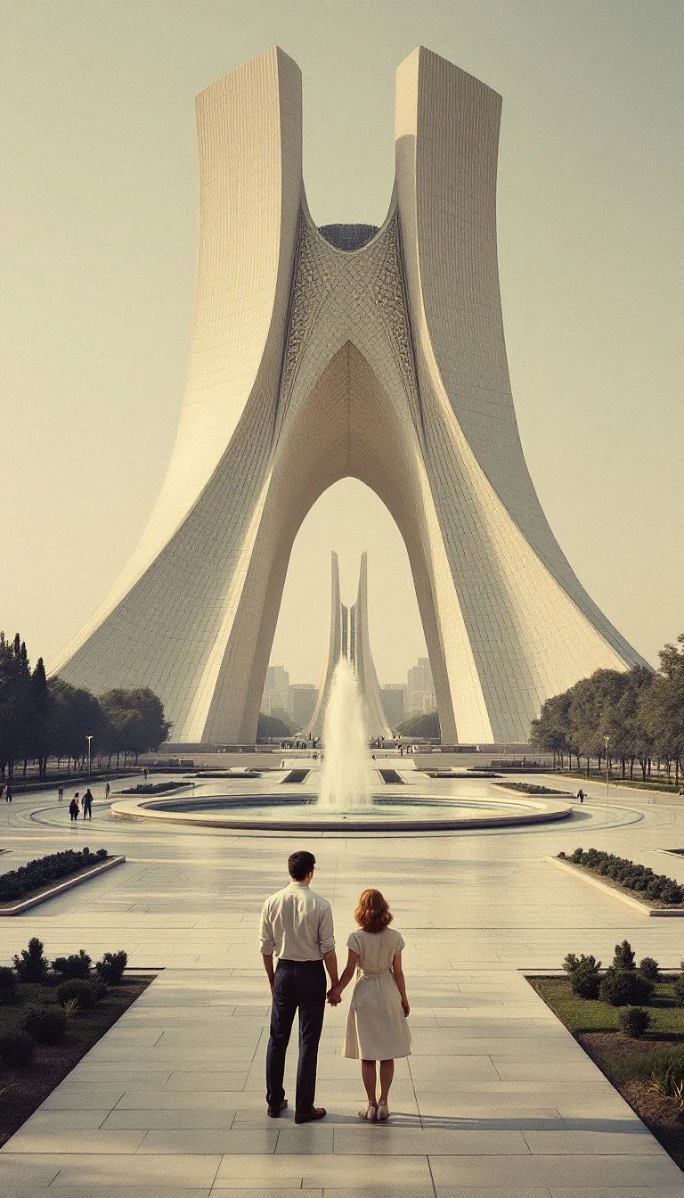A young couple from the 1950s stands in Tehran’s iconic **Azadi Square (formerly Shahyad Square) **, with the magnificent **Shahyad Tower** rising behind them. The tower, a masterpiece of Persian modernist architecture, stands tall with its distinctive **parabolic arch**, blending both traditional Iranian and contemporary styles. Its white **marble-clad surface**, sourced from Esfahan, glows under the afternoon sun, with intricate **geometric patterns** adorning its facade. The tower’s **four grand legs curve inward**, forming an elegant archway at the center, symbolizing the historical gateway to Tehran. * *The open **plaza surrounding the tower** is paved with large **stone tiles**, leading toward a **vast circular fountain** at the base of the monument. The water in the fountain reflects the sunlight, creating shimmering ripples that contrast with the solid architectural lines of the tower. Around the square, neatly arranged **pathways** extend outward, guiding visitors through the landscaped green areas with small trees and traditional Persian-style benches. * *The **couple stands near the edge of the plaza**, dressed in elegant 1950s attire. The **girl**, with voluminous, curly hair, cat-eye eyeliner, and red lipstick, wears a **floral-patterned dress** with a flared skirt. A gentle breeze lifts the hem slightly as she glances at her companion. The **boy**, in a **light-colored suit** with a thin tie, stands beside her, his neatly combed hair and thin mustache giving him a refined look. Their hands nearly touch as they exchange a soft smile, immersed in the beauty of the moment. * *Around them, a few **pedestrians walk leisurely**, some in **Western-style suits** and dresses, while others wear **traditional Iranian clothing**. The city’s **classic cars** from the era are parked nearby, their polished surfaces reflecting the golden hues of the afternoon sky. The **atmosphere is peaceful**, filled with the distant sound of footsteps, hushed conversations, and the gentle flow of the fountain. The **warm, muted tones of the scene** capture the nostalgic essence of 1950s Tehran, as the **Shahyad Tower** stands proudly as a beacon of Persian heritage and modernity.