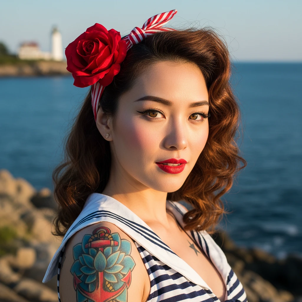 award-winning photo, ultra-realistic portrait of a stunning 1950s pin-up korean girl, flawless skin, hazel eyes, bold red lips, perfect winged eyeliner, brunette hair in vintage waves held by a red-and-white striped bandana, a large red rose tucked behind her ear. Details & Tattoos: She has intricate, traditional American sailor tattoos: a large, colorful red-and-blue anchor surrounded by blue lotus petals on her shoulder and a small nautical star on her chest. She is wearing a vintage navy and white sailor-style top. Setting & Lighting: Photographed on the coast with the deep blue ocean in the background. A picturesque white lighthouse is visible on a distant, out-of-focus shore. The scene is bathed in bright, warm, late-afternoon sunlight that makes the colors pop and gives her skin a healthy glow. Composition & Style: Medium close-up shot, sharp focus, cinematic quality, shot with a DSLR camera using an 85mm f/1. 8 lens to achieve a beautiful, creamy bokeh in the background. The mood is confident, nostalgic, and vibrant.