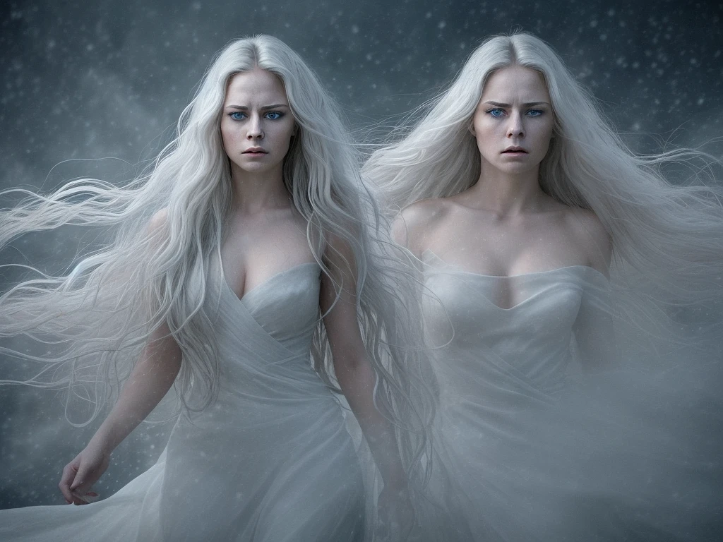 a breathtaking portrait of a woman with an aura of mystique, set against a backdrop of intense drama and passion. The scene unfolds like a sweeping epic, with the woman standing at the forefront, her long, wavy white hair cascading down her back like a river of snow. Her striking blue eyes seem to burn with an inner intensity, as if illuminated by a fierce passion. Her attire is a masterful blend of form and function, featuring a stunning black and gold hooded cloak that billows behind her like a dark cloud. The cloak is adorned with intricate gold accents, adding a touch of luxury and glamour to her overall appearance. A delicate gold necklace graces her neck, complemented by elegant gold earrings that add a touch of sophistication to her ensemble. Her nails are painted a deep, glossy black, adding a touch of edgy drama to her overall look. In her hands, she holds a book that appears to be engulfed in flames, adding a touch of drama and tension to the overall scene. The flames seem to dance across the pages, casting a warm, golden glow over the woman's face. The background of the image is a fiery blaze, with flames licking at the edges of the scene. The colors are muted, with shades of orange, yellow, and red dominating the palette. To the left of the woman, a dark and ominous landscape stretches out, with twisted trees and jagged rocks looming in the distance. The sky above is a deep, foreboding grey, with clouds that seem to swirl and twist in every direction. The overall effect is one of intense drama and passion, as if the woman is channeling the raw energy of the flames into her very being.