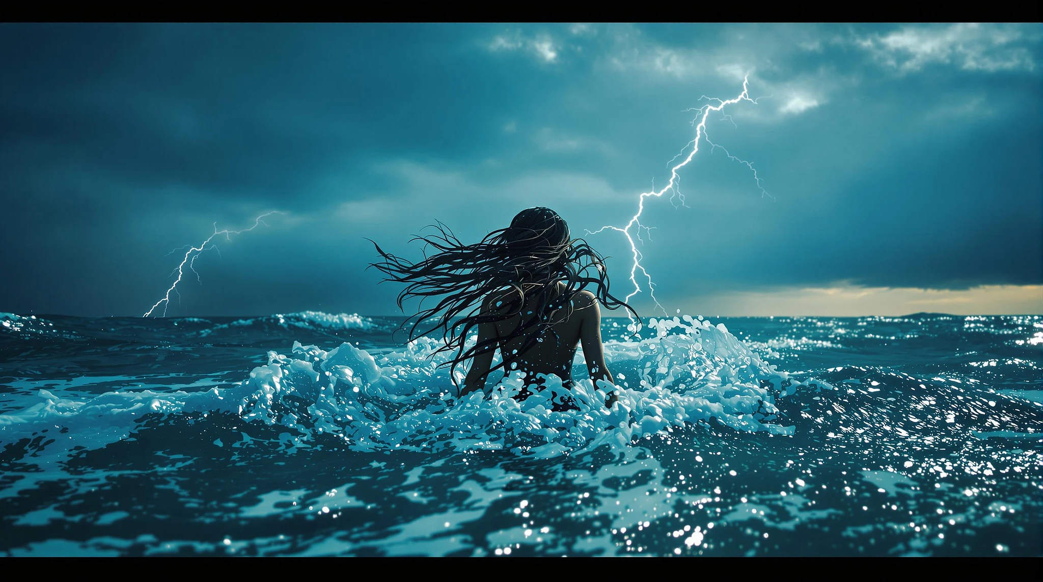 A fashion editorial, fashion photography, back view of Realistic Genshin Impact Women Raiden Shogun, looking back at us in Swell Waves ocean water during a thunder storm, Lightning in the sky, Long Curly Hair, Deep Blue Cloudy Sky, highres, realistic photo, professional photography, cinematic angle, dynamic light back shining.