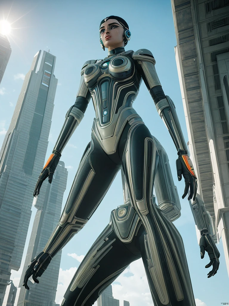 Futuristic Art Deco, ultra realistic, 8k full HD, low angle, unreal engine 5, cinematic, masterpiece, insane detail, real photography, bright colors, sun-soaked colours, Fujifilm X-T4, Sony FE 85mm --ar 900:1600 --s 750 --style raw --v 5. 2