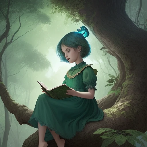 Output: a storybook like scene. subject: a half female kid human, half baby peacock hybrid character, sitting on a tree branch, reading a book. Background: some illustrated style forest trees. Emphasisers: bluish green core.