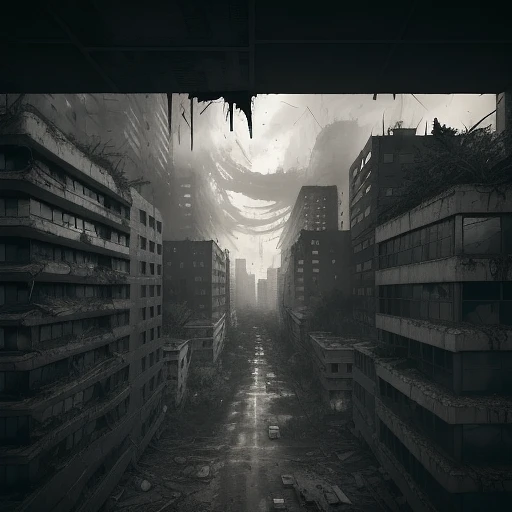 illustration black-and-white of View from one of the buildings in a post-apocalyptic cityscape inspired by 'The Last of Us'. The scene captures the desolation and haunting beauty of the abandoned urban environment. streets below are now overgrown with wild vegetation, crumbling buildings surround the viewer, their windows shattered and facades weathered by time, structures partially collapsed. The sky is overcast, somber and eerie atmosphere