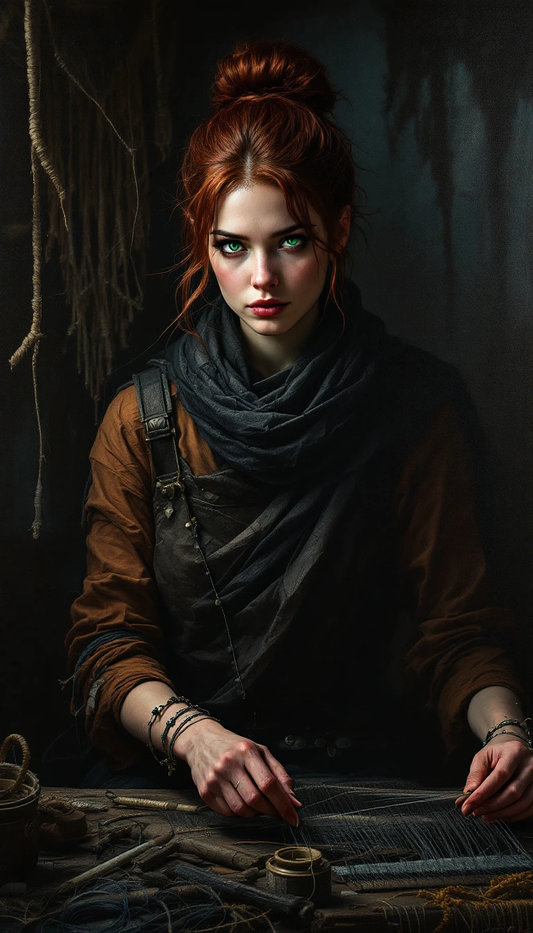 "Obsidian Weaver in a Shadowed Workshop": A compelling abstract painting features a weaver, displaying both focus and a sense of creativity. She is a skilled artisan, situated within her dimly lit workshop, with a pale complexion, dark red hair styled into a practical bun, and a simple but layered outfit. Fine threads and tools are woven around her wrists and hands. The artwork masterfully blends contemporary art and a character study, with a striking interplay of colors, such as blacks, grays and silver. Her intent, emerald eyes, the composition’s focal point, convey both focus and passion. After a long night of work, the weaver embodies skill and quiet determination. The layered arrangement and subtle lighting urge the observer to explore the untold stories within this vibrant artwork, presented as a painting.